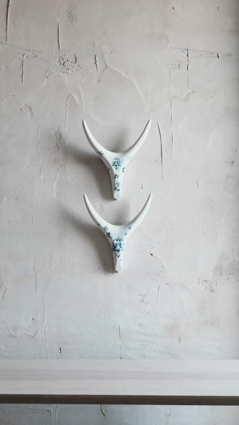 The piece merges the rustic silhouette of antlers with the refined look of blue and white porcelain, inspired by traditional ceramic motifs, but with a minimalist and contemporary edge.