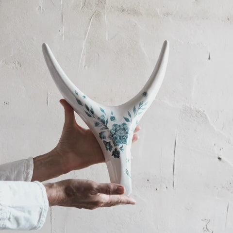The piece merges the rustic silhouette of antlers with the refined look of blue and white porcelain, inspired by traditional ceramic motifs, but with a minimalist and contemporary edge.